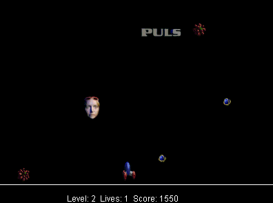I wrote two simple computer games recently. The first is called Puls in Space and was made for a youth-oriented Danish television program called Puls. It's the kind of thing where you have a variety of different hosts and a lot of young people are very actively engaged in evaluating them. In this game you naturally control a spaceship and get attacked by the heads of the hosts.