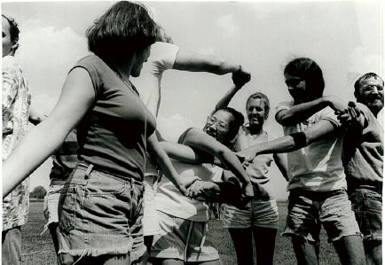 Is this a problem with games as such, or can it be fixed? From the early 1970s, the New Games Movement (New Games Foundation 1976) experimented with creating communal games, analog, often outdoor games such as Knots shown in Figure 8. These games would sometimes be competitive, but the selection of a single winner was generally avoided. Designer Bernie DeKoven argues that such games exist because the focus on winning can be to the detriment of the community of players: