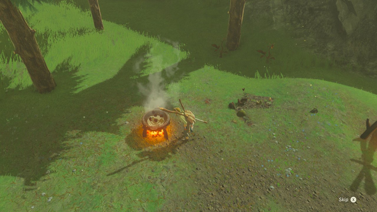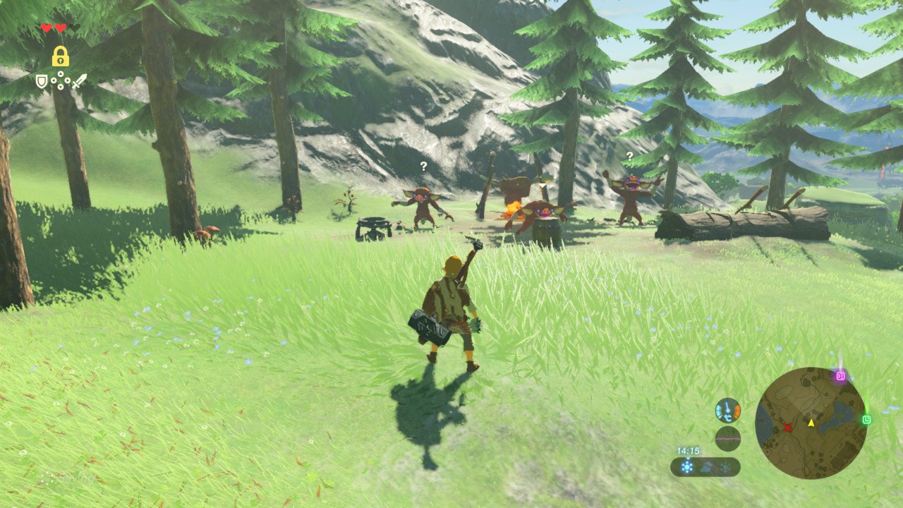 The aesthetics of the aesthetics of video games: But we navigate game worlds with the expectation that they have been designed with goal-oriented behavior in mind. The Legend of Zelda: Breath of the Wild (Nintendo EPD 2017) situation shown in Figure 7 is not a natural occurring arrangement of objects but deliberately designed. Right next to an area too cold to enter, a group of bokoblins have clearly been placed by a level designer such that they guard some also deliberately placed spicy peppers next to a deliberately placed cauldron needed to cook said peppers – all in order to make Link resistant to cold for a while so he can enter the area.