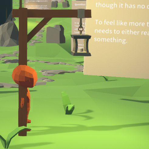 This essay focuses on games with 3D worlds. In a virtual reality headset, the differing inputs from our two eyes impart us with a sense of depth that shows us that something is not a flat picture. This experience is on one hand unavailable on a flat screen, but here we get a similar sense of depth by changing our viewpoint on the world. But a sense of depth only shows us that the pixels are not a flat picture - they may still be a sculpture that signifies a type of object.Behavioral relevance