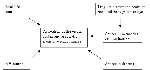 In Moving Pictures (Grodal 1997), Torben Kragh Grodal presents that he describes as a "holistic" or evolutionary-cognitive theory of how movies and movie genres affect the viewer. Grodal's theory is in opposition to both structuralist film theory (like Roland Barthes') and psychoanalytically inspired theory (like Christian Metz). According to Grodal (and the cognitive science that be builds on), humans are characterised by that fact that we are constantly creating mental models of ourselves and others. When looking at another human (or a representation of another human) we inevitably create a mental model of that person's bodily being, of his/her goals and wishes. This is related to our basic capability of thinking about absent things, and that we can run through a situation "as a test"; without really being in that situation. This means that the image of a cup and reading the word "cup" activate the same brain centres that are activated when we see a cup in the physical world. Different sources result in the activation of the same mental image: